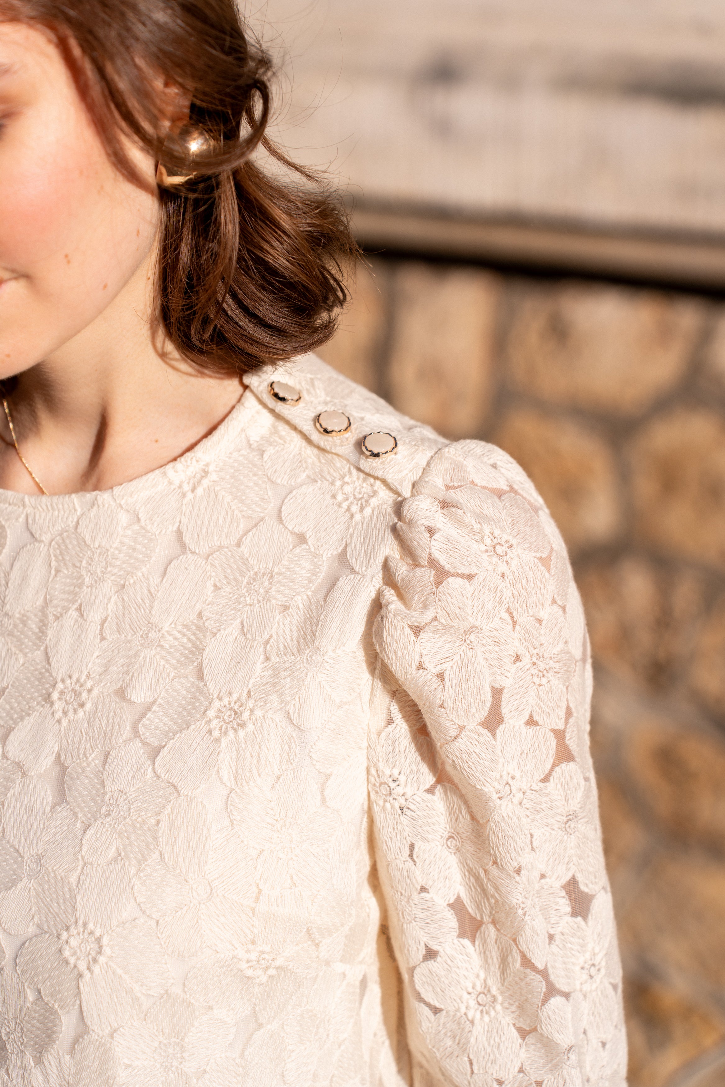 La robe Cécilia charme par son effet brodé et ses détails fleuris délicats. Ses manches longues et son boutonnage raffiné ajoutent une note de romantisme.