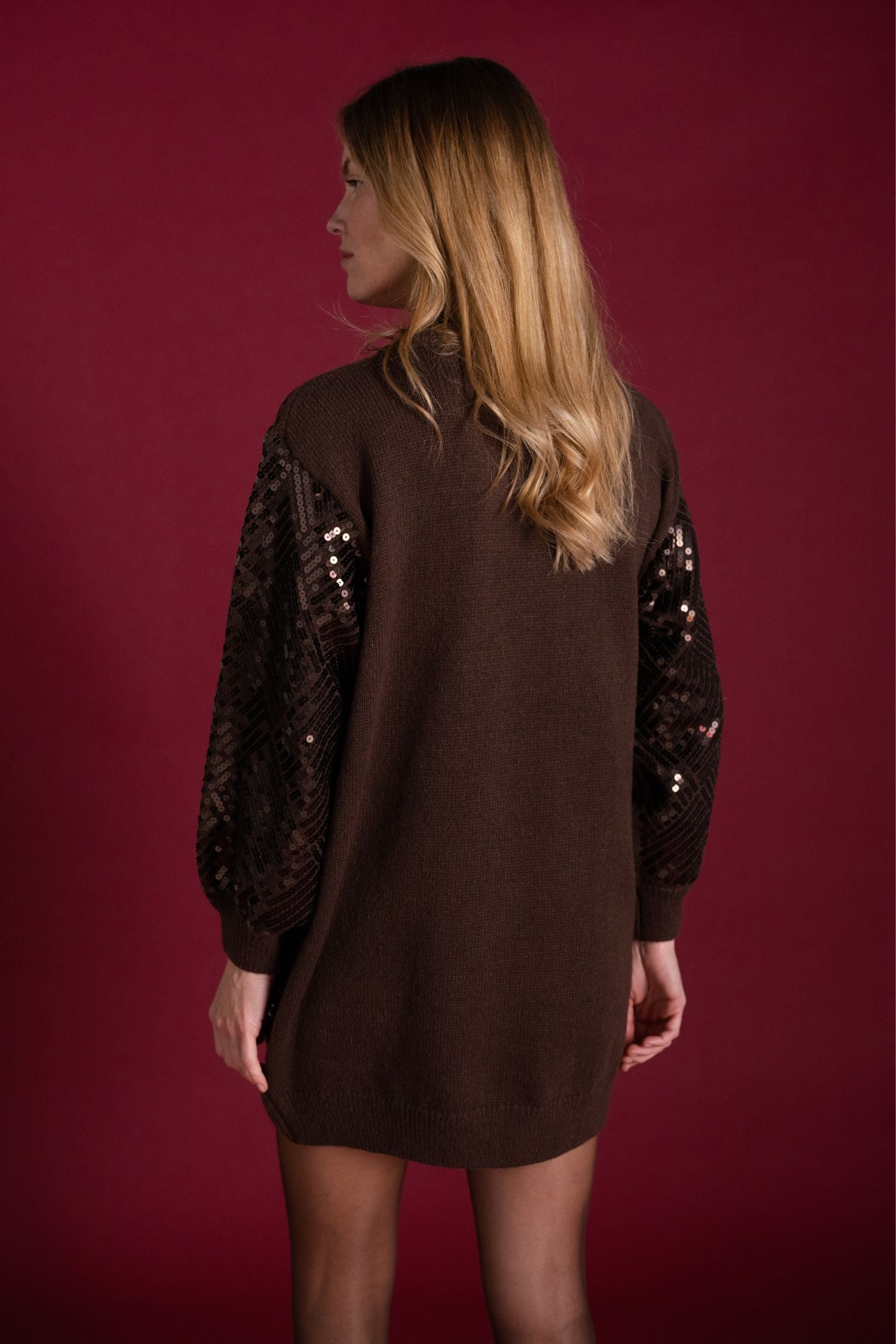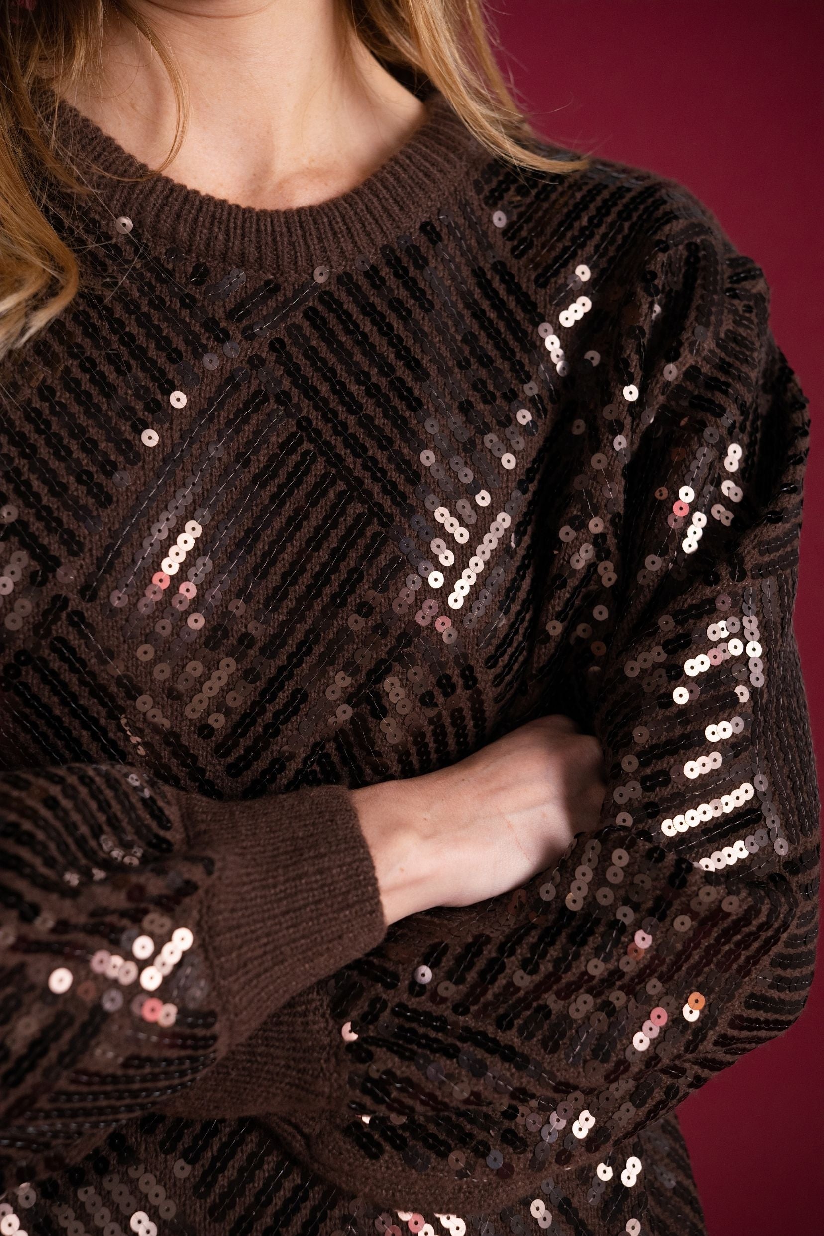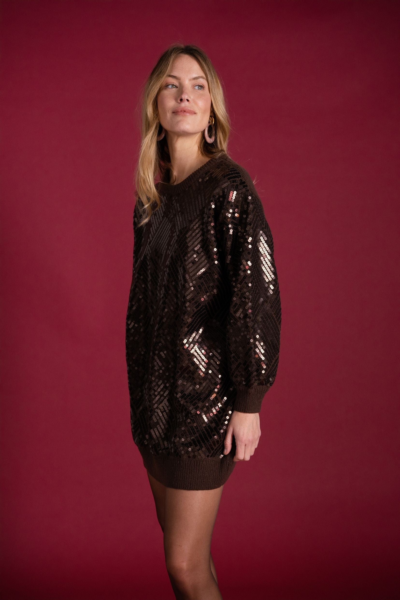 Une pièce douce, enveloppante, mais qui ne renonce jamais à la féminité. Son tissu chocolat, parsemé de sequins graphiques, capte la lumière comme une mosaïque en mouvement, un jeu d’ombres et de reflets qui sublime chaque silhouette.