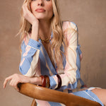 La robe longue Odeline capte le regard dès les premiers instants. Ses nuances de bleu, de jaune et d’orange illuminent la silhouette et lui insufflent une fraîcheur solaire.
