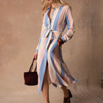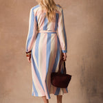 Son col chemise apporte de la tenue à l’ensemble, tandis que le lien à la taille souligne la silhouette avec justesse. La jupe ample et fluide accompagne les pas et crée un mouvement léger et féminin.