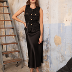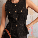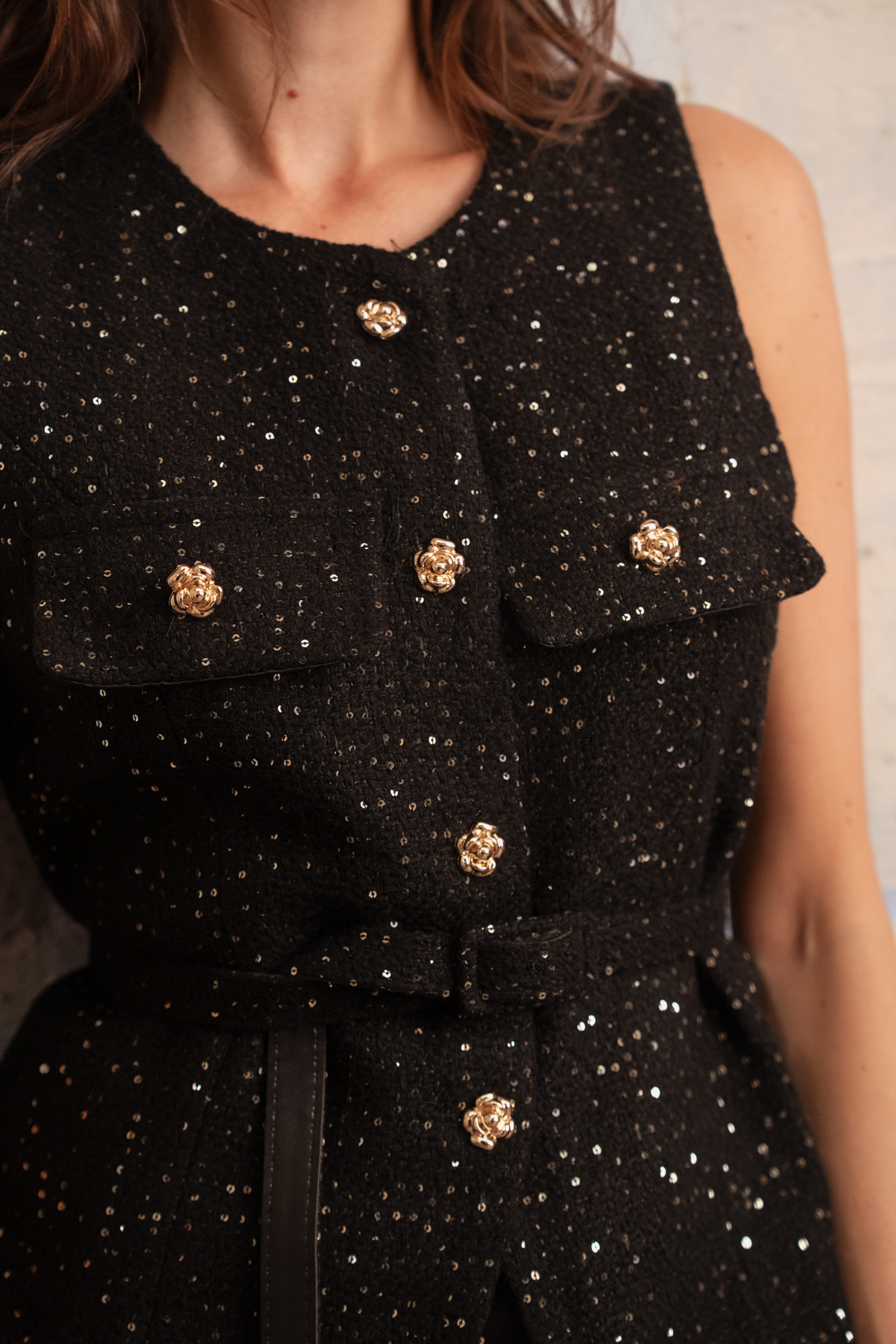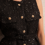 Avec sa coupe sans manches, ses boutons dorés et sa matière texturée subtilement brillante, elle mêle esprit couture et modernité. Sa ceinture intégrée vient marquer la taille avec élégance, créant une silhouette féminine et affirmée.