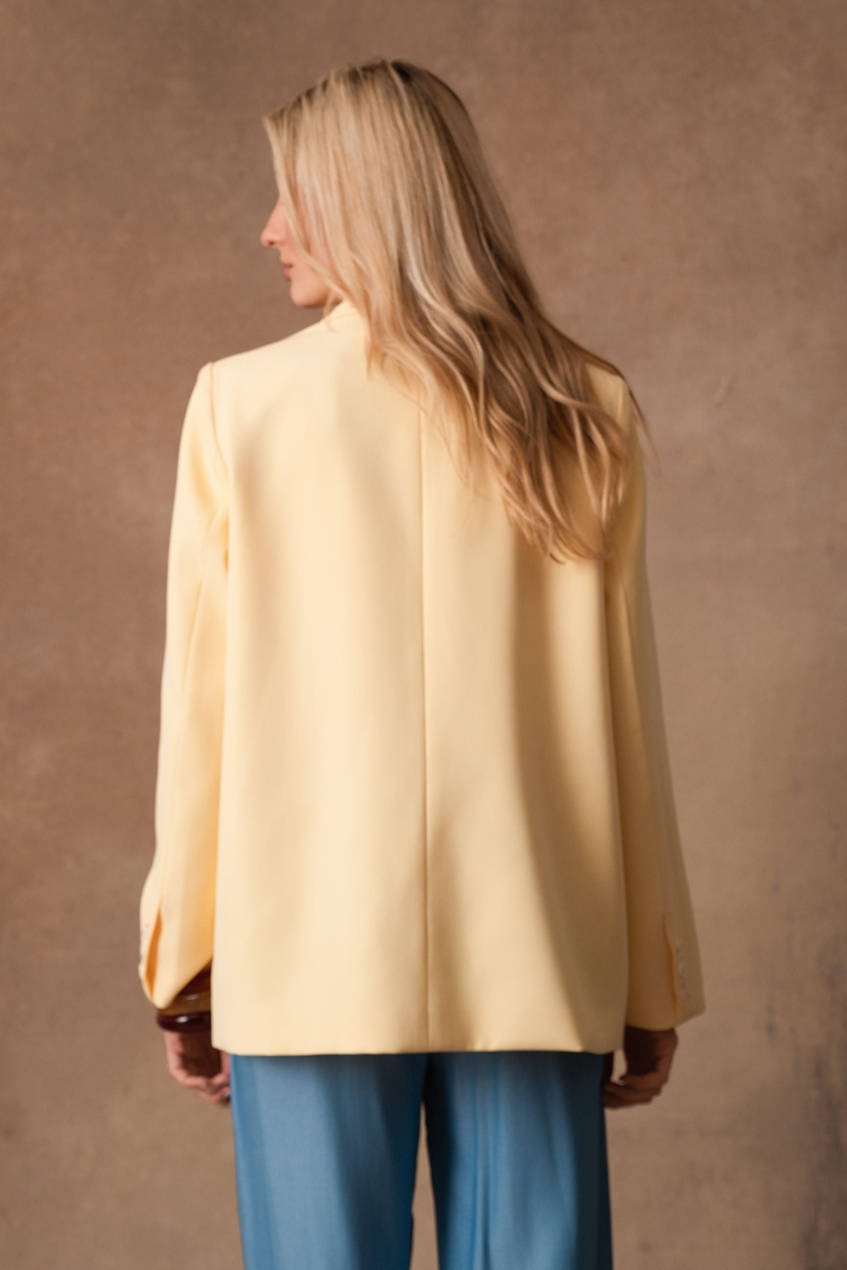 Wendy, la veste qui traverse les saisons avec une élégance naturelle, se décline désormais en jaune lumineux. Sa ligne de costume, nette mais jamais stricte, structure la silhouette avec douceur. Le jaune soleil réchauffe les looks et s’accorde à tout, du plus minimal au plus habillé.