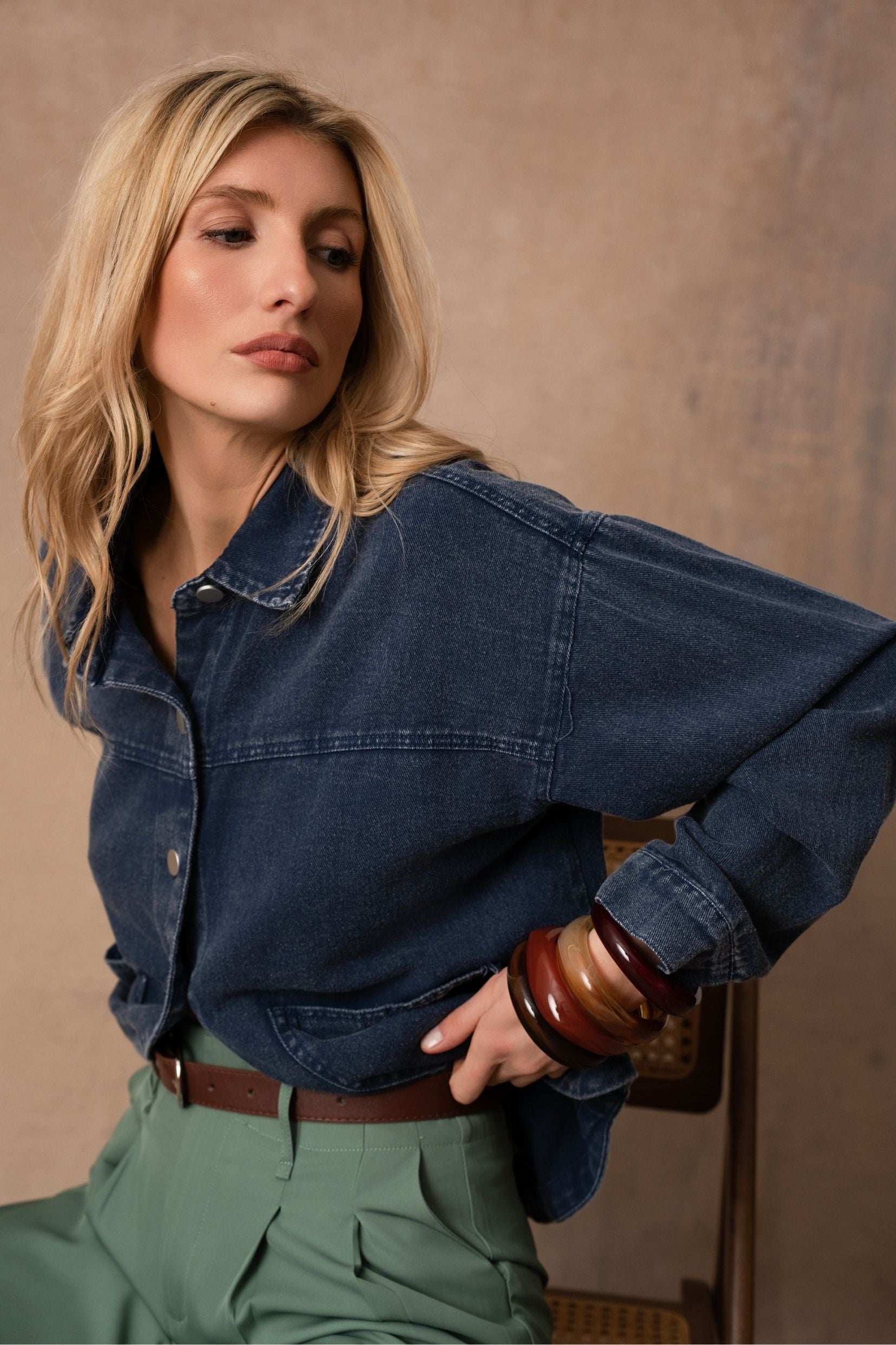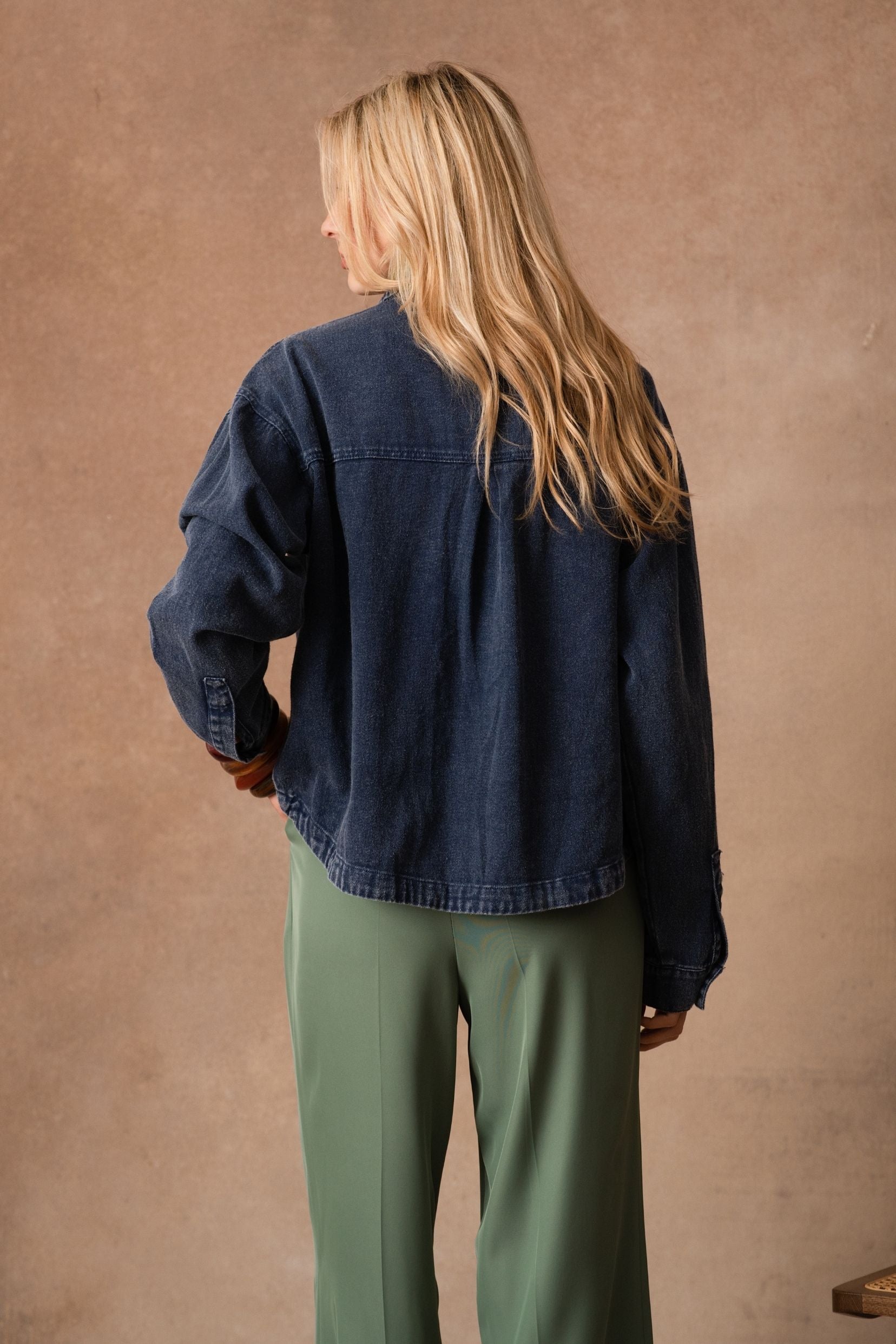 Inspirée de la veste en denim, sa coupe légèrement oversize et ses grandes poches plaquées lui donnent une allure décontractée et moderne. Dans son coloris brun profond, elle devient la pièce idéale à superposer : par-dessus une robe fluide pour casser les codes, ou avec un pantalon imprimé pour un look assumé.